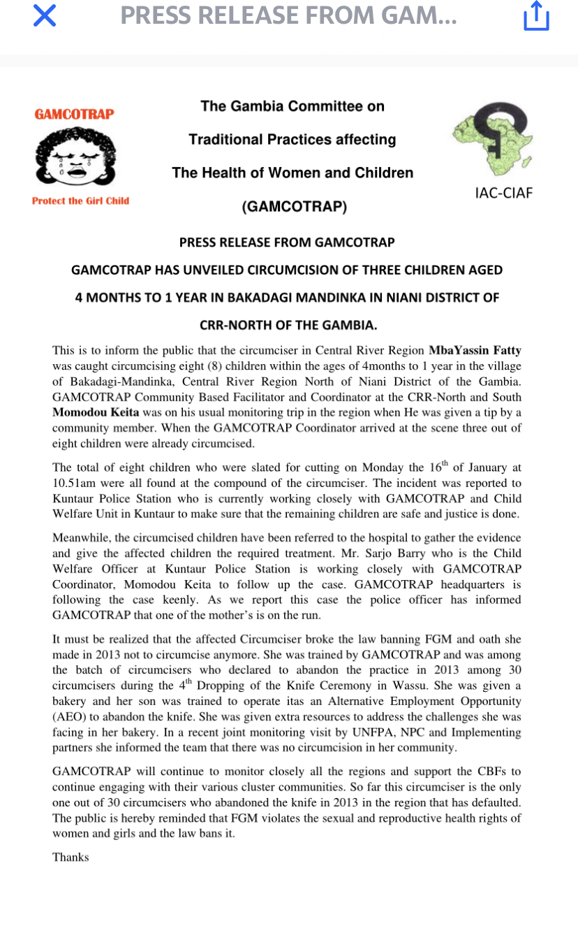 The total of eight children who were slated for cutting on Monday the 16th of January at 10.51am were all found at the compound of the circumciser. The incident was reported to Kuntaur Police Station who is currently working closely with GAMCOTRAP and Child Welfare Unit in Kuntaur to make sure that the remaining children are safe and justice is done.